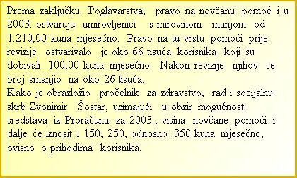Napomena: pomoć se isplaćuje samo onim umirovljenicima koji su, do 31. prosinca 2002., potpisali izjavu o ukupnim prihodima. Oni koji to nisu učinili iz opravdanih razloga (nepokretne osobe, bolesni i sl.), mogu se javiti u Gradski ured za zdravstvo, rad i socijalnu skrb u Ulici grada Vukovara 56 a, tel. 610-0923.