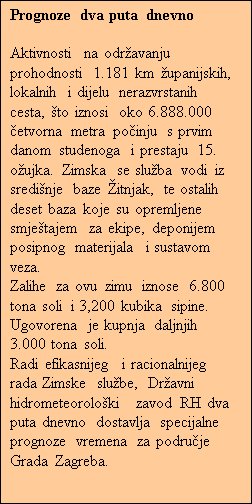 Od 6. siječnja kad je, oko 22 sata, u Zagrebu počeo padati snijeg i nije prestao puna 24 sata, Zimska je služba za čišćenje grada potrošila trećinu ukupnih zaliha soli. Na teren je izašlo 94 redovnih i 28 rezervnih ekipa, a u gradskim su četvrtima postavljena 64 kontejnera napunjena solju kao prva pomoć u područjima na koja nije stigla mehanizacija.